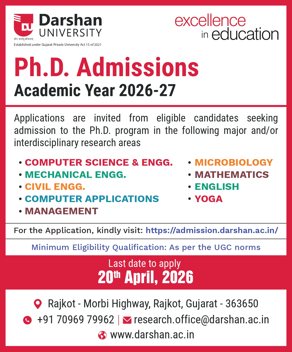 - Performance in the Ph.D. Entrance Test to be conducted by Darshan University & fulfilment in the subsequent Interview.
